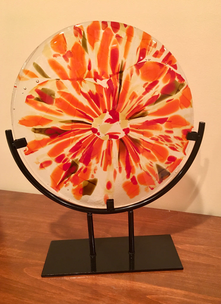 This 12 x 12 piece is an array of oranges and reds. The picture really doesn't do it justice.. sorry! Includes a sturdy steel stand.