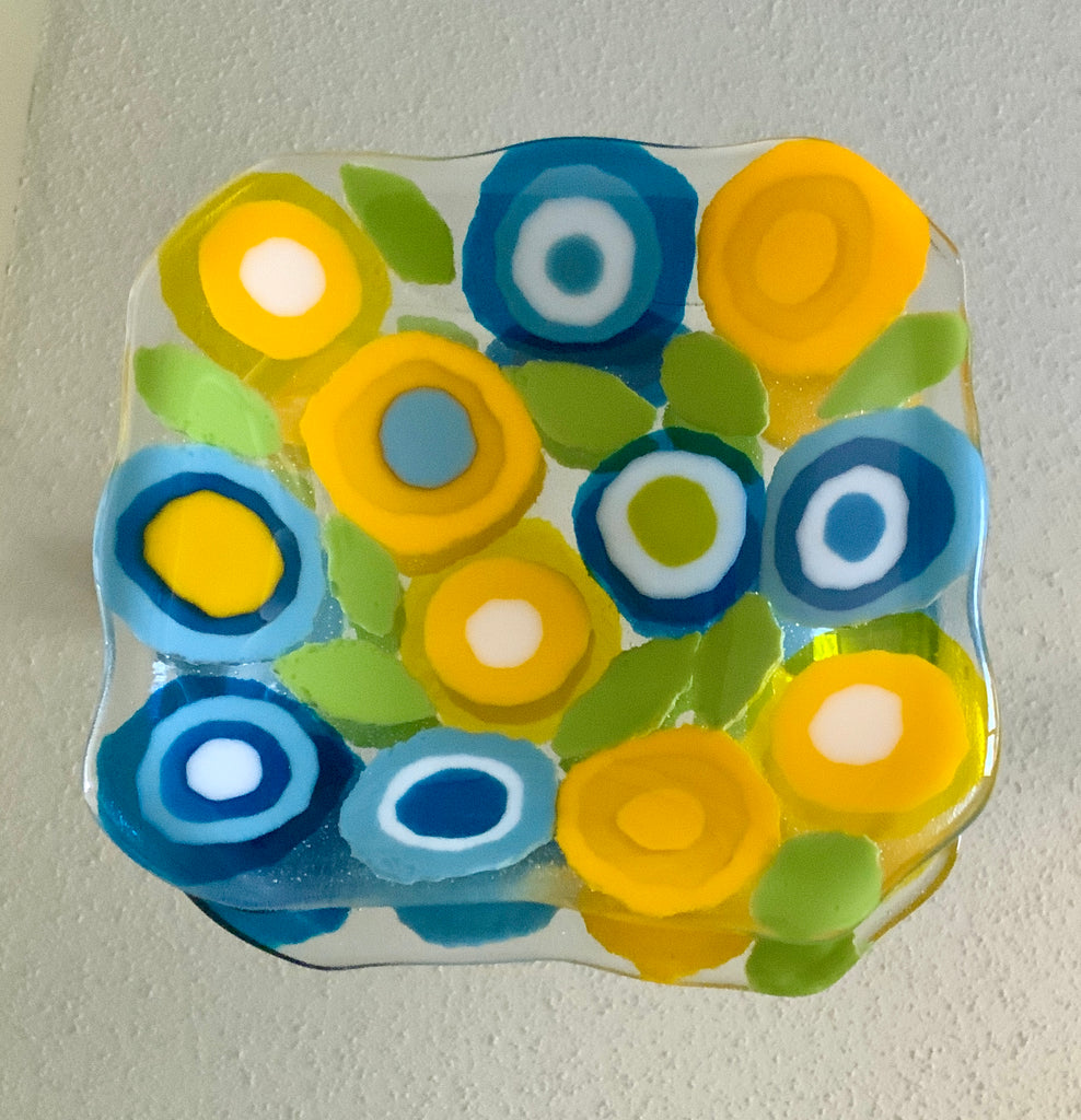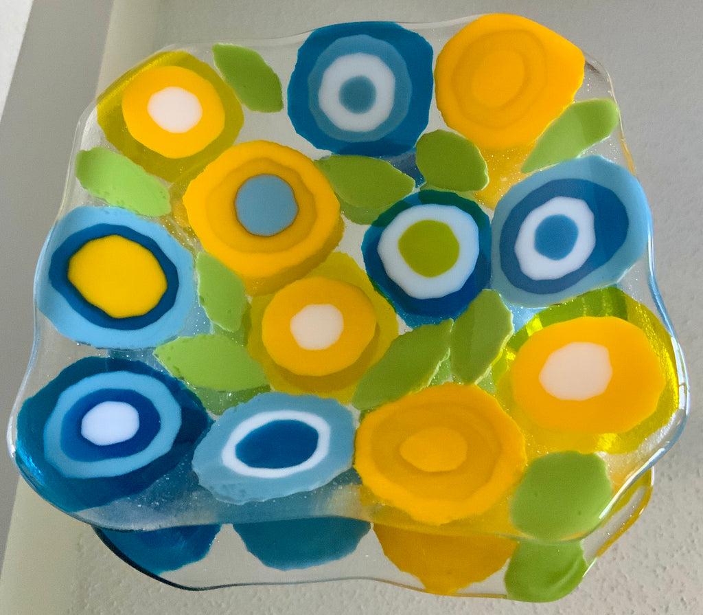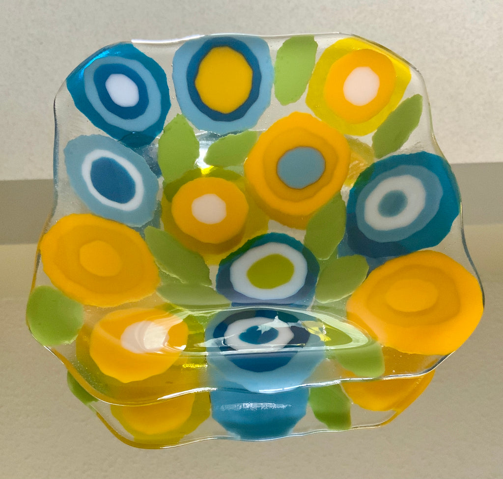 This bowl measures 8 x 7.5" and is 1 ½" deep. It is flawless and some of the organic flowers are 3 layers thick. The glass was not cut but rather "nipped", giving it a ruffled effect. The space in between was filled with clear glass frit.