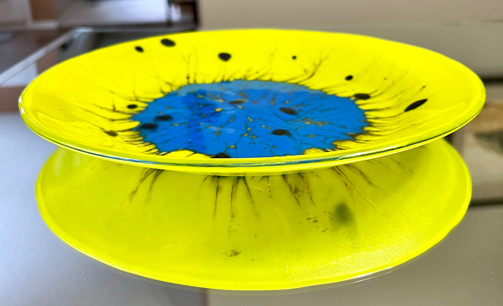 This dish measures 10 x 1". It was created using different colors of powdered glass and water to make a slurry, sort of a soupy mix. Then added onto a base of clear glass. Once I "think" I have done all that needs to be done, it must be allowed to completely dry out, going back to its powder form. This can take up to 2 days. Then it takes another 2 days to go through the various kiln stages.
